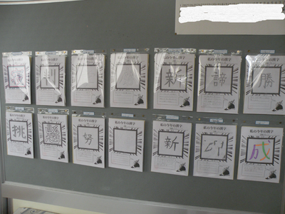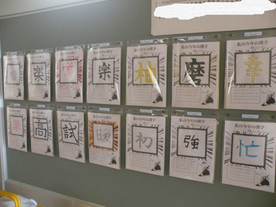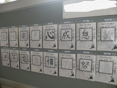 2023年12月6日 11時15分1年生の廊下の掲示板にそれぞれの今年を振り返って、漢字一文字が掲示されています。「新」「挑」「楽」「心」「努」などが多く書かれていました。みんな明るい文字で表しており、良い形で今年が終了でき、また新しい年を迎えることができます。