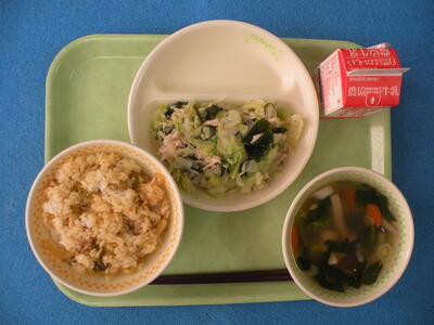 2023年12月6日 12時40分今日のメニューは、キムタクごはん・海藻サラダ・春雨スープ・牛乳でした。今日はメニューのみの掲載とさせていただきます。とても美味しかったです。