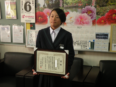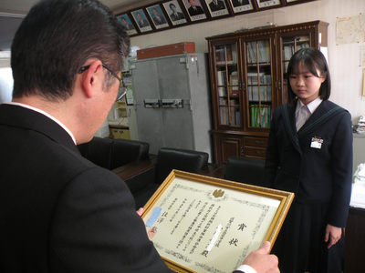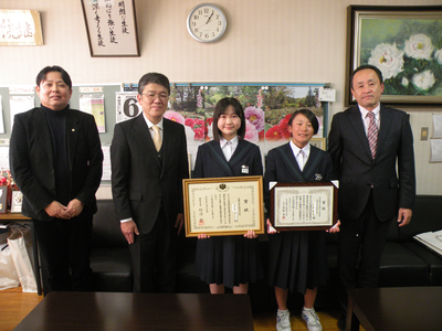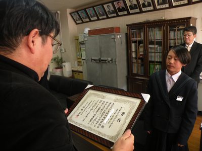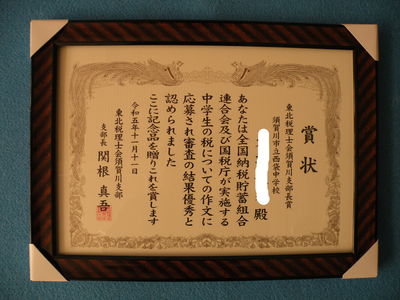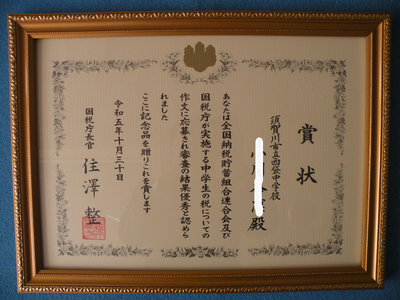 2023年12月6日 13時40分本日、須賀川税務署署長様と東北税理士会須賀川支部支部長様をお迎えし、表彰式が行われました。2年生女子生徒が最高賞である国税庁長官賞、1年生女子生徒が東北税理士会須賀川支部長賞を受賞しました。おめでとうございます。名誉ある賞を受賞し、改めまして本校生徒のすばらしさを感じました。