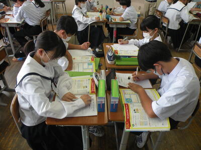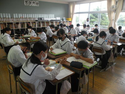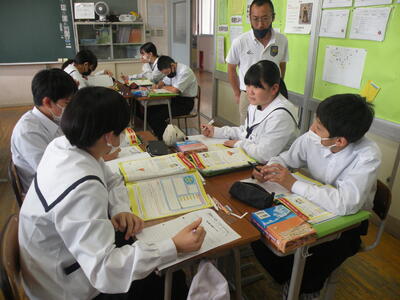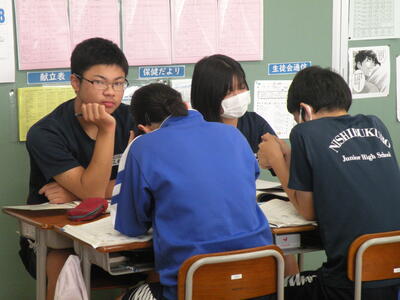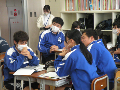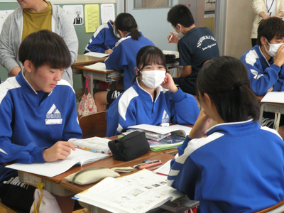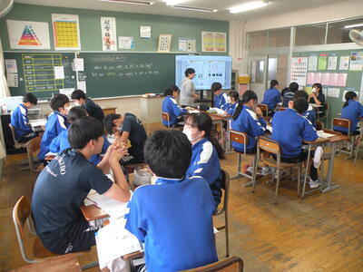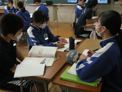 2023年10月5日 14時10分積極的に発言している生徒が多いです。グループで協力し合って、課題解決に迫っていました。教科担任の先生の発問もやる気を引き出すような内容でした。みんな頑張ってくださいね!