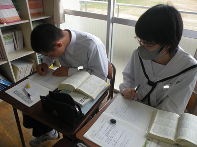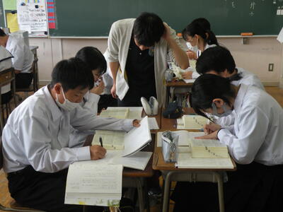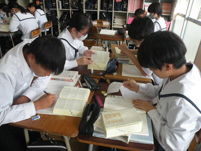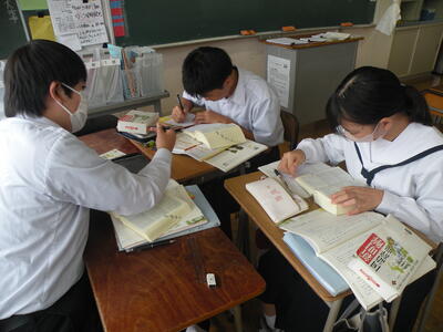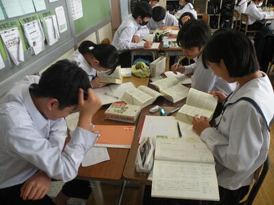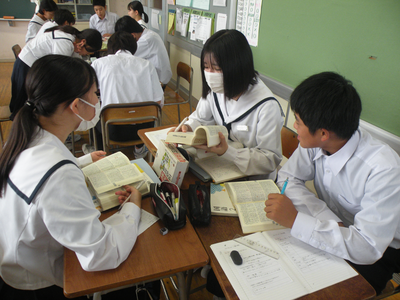 2023年10月5日 11時40分辞書を使いながらの国語の授業でした。グループ内で協力し合って一生懸命に取り組んでいました。