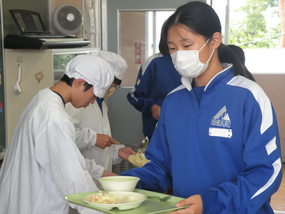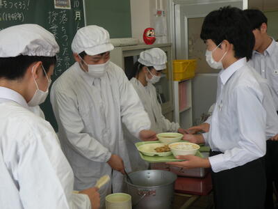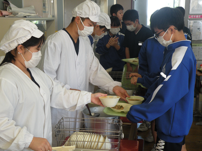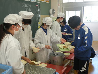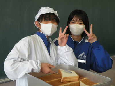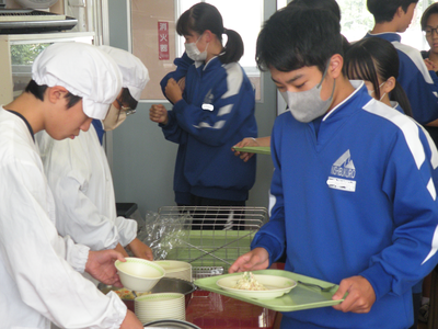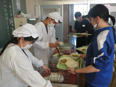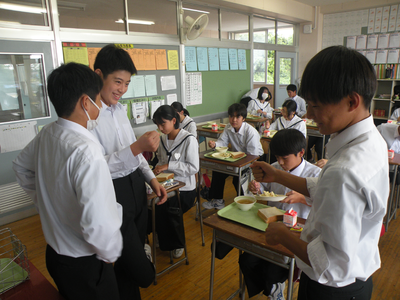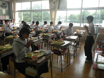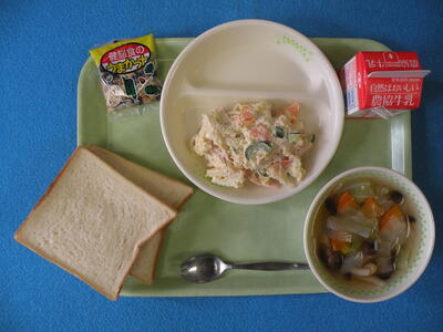 2023年10月5日 12時50分今日のメニューは、食パン・ポテトサラダ・大豆入り野菜スープ・うまかってん・牛乳でした。今日は2年生の教室を訪問しました。いつも明るい2年生の生徒たちです。