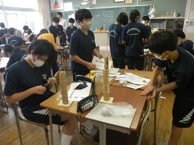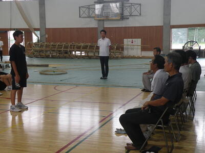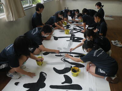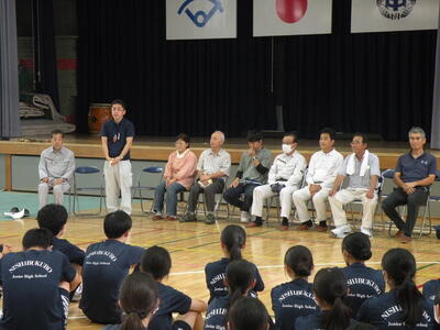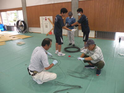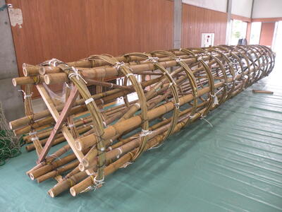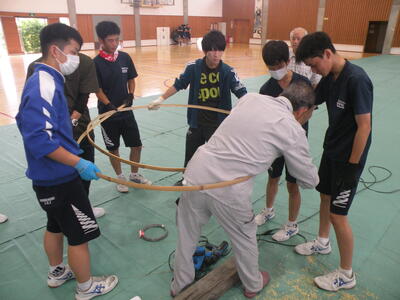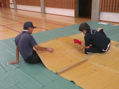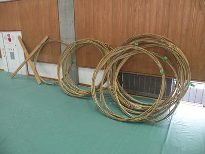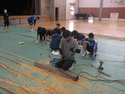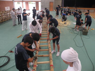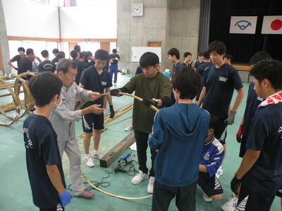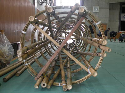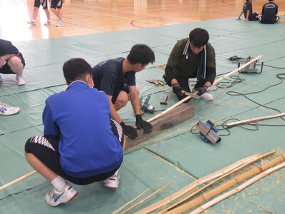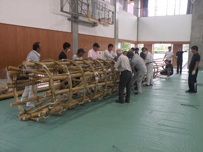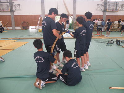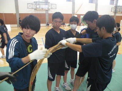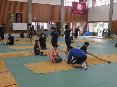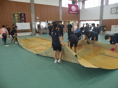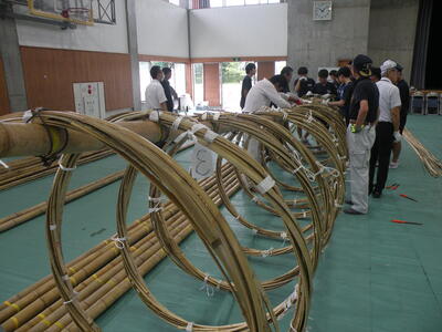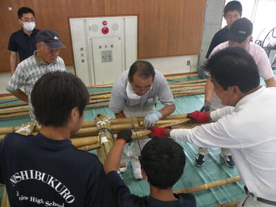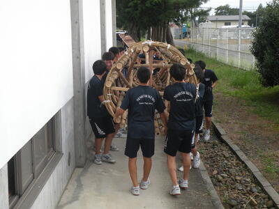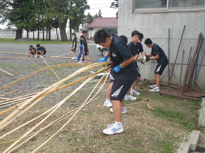 2023年9月20日 16時05分松明骨組み・はしご・畳の表縫い・来年度のたがと完成しました。参加された地域の方より「西中生徒は男子も女子よく働くね!」とお褒めのお言葉をいただきました。ありがとうございました。笑い話を1つ、畳の表縫いが完成し、みんなで一斉に持ち上げようとしたら、間違ってフロアに敷いたシートまで縫ってしまいました。良い思い出です。