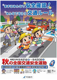 2023年9月21日 06時50分本日、9月21日(木)~30日(土)まで、令和5年度秋の全国交通安全運動が実施されます。運動のスローガンは『反射材「ここにいるよ!」のメッセージ』です。ご家庭でのご指導もよろしくお願いいたします。なお、保護者の皆様・ご家族の皆様も安全運転に心がけてください。