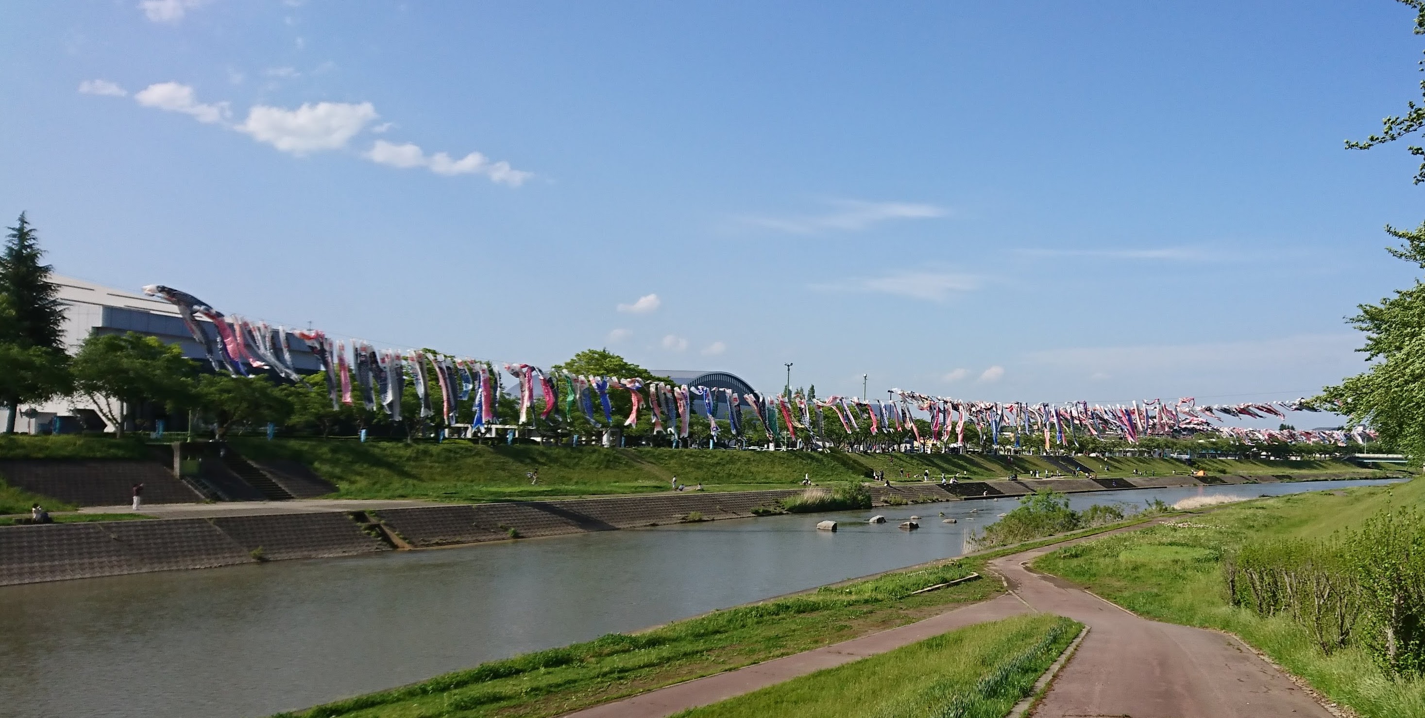 2018年5月5日 13時00分今年も釈迦堂川に、こいのぼり約560匹が川をまたいで掲げられ、川面の風を受けて元気に泳いでいます。間もなくGWも終了しますが、こいのぼりに負けないよう健康管理をお願いします。