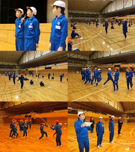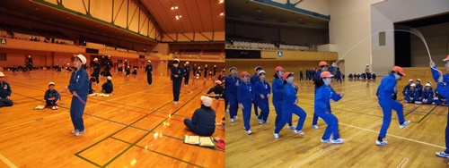 個人の技能種目は、持久跳び3分間、かけ足跳び1分間、あや跳び1分間の3種目を行いました。本番ということもあり、緊張した表情で跳び始めた子どもたちでしたが、練習の成果をしようと一生懸命跳んでいました。
