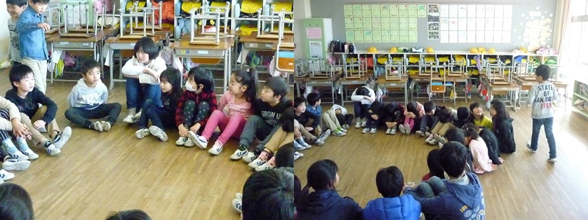 業間の時間に、6年生と1年生が「はんかちおとし」や「ジェスチャーゲーム」を