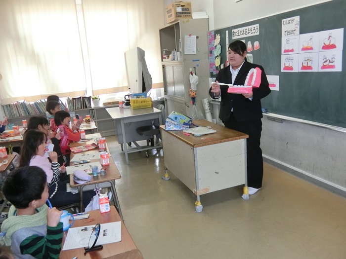 カラーテスターという歯に付いた汚れに色を付ける薬を使ってみると・・・・・口の中が真っ赤!!「さっき歯みがきしたはずなのに!」「うわあ、汚れだらけだ!」と子どもたちはびっくり!!ですが、伊藤先生と一緒に歯みがきをしてみると、もとの輝きを取り戻すことができました。歯みがきのポイントは、「力を入れずに小さくこちょこちょと動かすこと」だそうです。