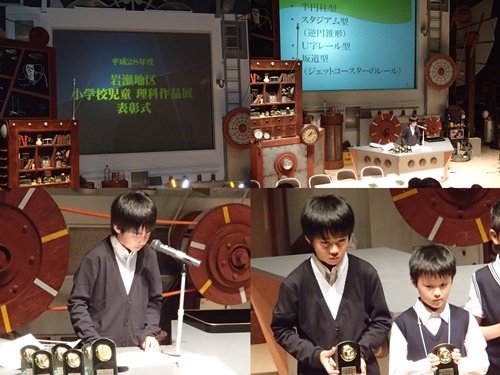 3連休2日目の18日(日)、ムシテックにおいて、岩瀬地区小学校児童理科作品展表彰式が行われました。西袋第一小学校から理科部長賞を受賞した、6年生清水大悟くんと5年生齋藤隆葵くんが、自分の研究した内容を発表しました。清水大悟くんの研究テーマは、「ピンポンリレー対決 構造物大実験」。齋藤隆葵くんの研究テーマは、「ムシを科学する~昆虫パワーのメカニズム」でした。発表を聞いている人にもわかりやすくプレゼンテーションすることができました。大変素晴らしい発表でした。来年はどんな研究をするのでしょうか。今からとても楽しみです。