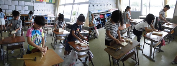 子どもたちは、釘のうち方を学び、自分の思い描く作品になるように「トントントン」、「ドンドンドン」と音楽の音色のような音を出しながら話もせず、夢中で活動していました。