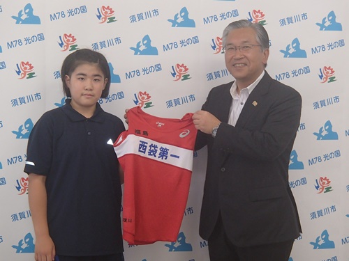 さんからユニホームを贈呈されました。福島県の代表として出場する松岡さんに、ご声援を