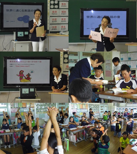 7月14日(木)の3~5時間目に、英語はつおん教室が行われました。日本航空国際線スチュワーデスとして勤務されていた大空メイ先生に、「発音記号のよみ方」を教えていただきました。大空メイ先生より5年生93名に、「はじめての発音記号~発音記号れんしゅう辞典」のプレゼントがありました。