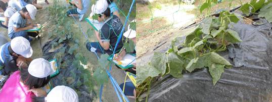 子どもたちは、ヘチマの成長を見て「すごい!」「ツルがからまっている」などの声が聞こえてきました。