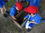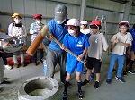 次に、2班に分かれゴミ収集車にゴミを投げ入れる体験をしました。スイッチも入れさせてもらい貴重な体験に興味津々。1台の車両に2tのゴミが入ることに驚いていました。