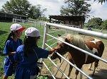 動物へのえさやりでは、手のひらにえさをのせて食べさせるのですが、ちょっと怖いよという子は、専用のスコップにのせて食べさせました。なれていくと、動物の体に触って、「かわいい」「ふわふわだ」などと言っていました。今月生まれたモルモットにも触ることができて、みんな、やさしく、そーっとなでていました。
