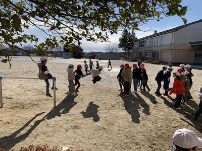 体育の時間はもちろんですが、休み時間などにも練習に励む子どもたちの姿が見られます。この1週間、雪が積もったり、校庭の状態が良くなかったりして、なかなか広いスペースで練習するのが難しい状況ですが、それぞれが工夫をして長縄の練習をしています。校庭が乾いて何とか練習できるわずかなスペースを見つけて、4年生が自主的に練習をしていました。