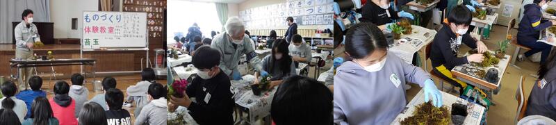 17日(木)卒業制作の一環として、福島県の各地域から「ものづくりマイスター」をお招きし、こけ玉づくりを実施しました。体育館で作り方の講義・制作実演を行ったのち、各教室に分かれて制作に取り組みました。