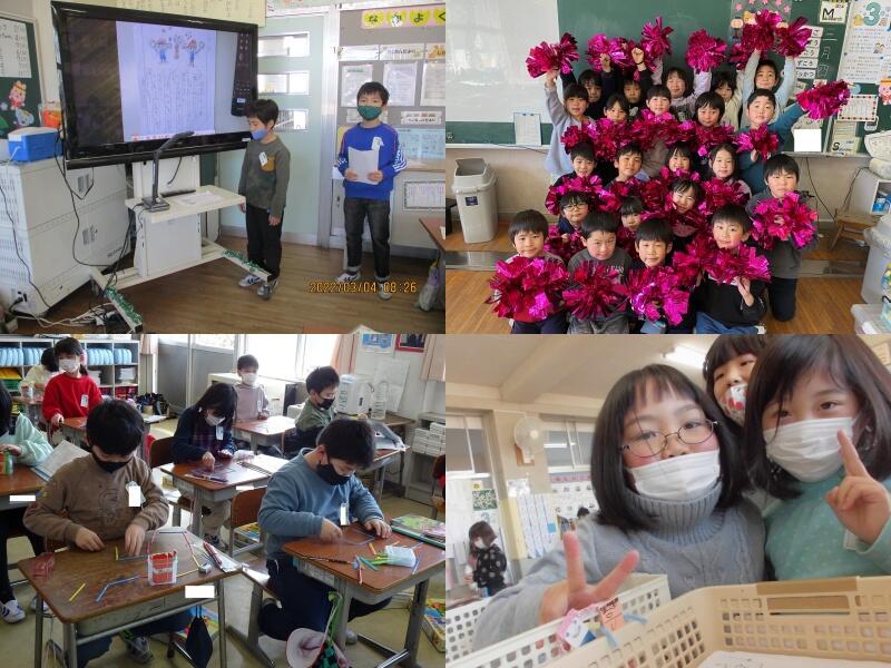 1組 国語科「いいこといっぱい、一年生」の学習の様子です。一人一人1年間をふり返り、思い出を絵と文でかきま した。今回はその発表の様子です。作文をテレビ画面に映しながら、大きな声で読みました。作文も発表もとても上手です。