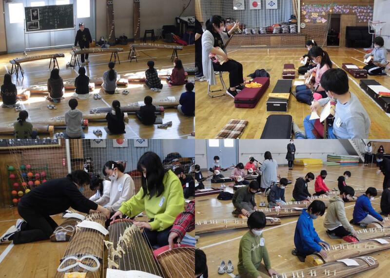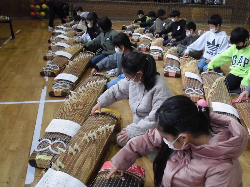 今年度も後藤先生にご来校いただき、各学級に分かれて箏教室を実施しました。箏だけでなく、三味線や十七絃の担当にも分かれながら、それぞれの楽器を時間いっぱい練習し、最後は全員で「さくらさくら」を演奏しました。