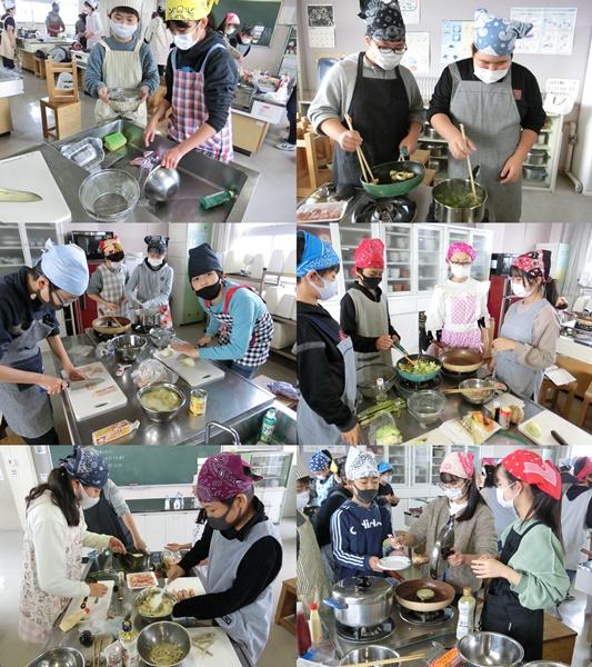 6年生が、調理実習を行いました。「まかせてね 今日の食事」の単元で、1食分の献立のおかずを考え、計画に沿って準備を進めてきました。野菜のベーコン巻きやジャーマンポテトなどメニューはさまざま。みんなで協力しておいしいおかずを作ろうと、一生懸命取り組んでいました。野菜を切る子、炒める子、洗いものをする子など、グループでしっかりと分担して、手際よく実習を行っていました。2度目の調理実習とあって、料理の腕がどんどんあがってきました。ちょっと焦げてしまっても、野菜が少しかたくても、みんなと作った料理の味は格別です。家庭科室が笑顔でいっぱいになりました。実習を行うにあたり、材料などをご家庭で協力していただきました。ありがとうございました。ご家庭でも、どんどんお手伝いをさせてください。調理がとても上手になりました。