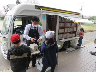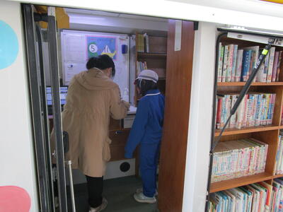 2022年4月14日 10時37分業間休み時間に移動図書館がやってきました。図書担当の先生が、移動図書館のことを校内放送で知らせると、子どもたちが次々にやって来て借りる本を選んでいました。1年生も担任の先生と一緒に本探しを楽しんでいました。学校図書館と併せて、この移動図書館も活用して本に親しませていきたいと思います。