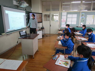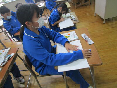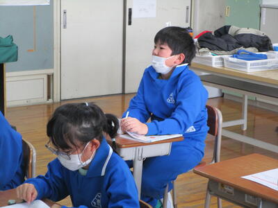 4年生の算数は、「変わり方調べ」の学習でした。比例や反比例の考え方につながっていく、大切な学習です。単に正解、不正解だけでなく、「なぜその答えになるのか」を説明できることが重要です。4年生もそれを十分に理解し、自分の考え方を式や図でノートにわかりやすく表していました。また、友達の説明を真剣に聞くことで、さらに理解を深めようと頑張っていました。