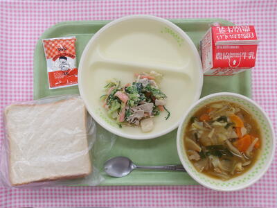 2024年5月16日 12時20分本日の給食の献立は、「食パン 牛乳 豚しゃぶサラダ 米粉ワンタンのカレースープ クリームゴールド」です。総エネルギーは、704㎉です。今日のメインは、豚しゃぶサラダと米粉ワンタンのカレースープです。豚しゃぶサラダには水菜が入っていて、シャキシャキとした食感を楽しみながら食べました。米粉ワンタンのカレースープには、米粉を使ったワンタンがたくさん入っていました。気温が上がらず、少し肌寒い今日にぴったりの温かいスープでした。おいしい給食、いつもありがとうございます。
