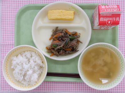 2024年5月27日 12時30分本日の給食の献立は、【地産地消献立】「麦ごはん 牛乳 厚焼き卵 金平ごぼう さやえんどうのみそ汁」です。総エネルギーは、608㎉です。今日は、具だくさんの金平ごぼうでした。豚ひき肉、ごぼう、にんじん、さやいんげん、玉ねぎ、しらたきが入っていました。ご飯に合う味で美味しかったです。おいしい給食、いつもありがとうございます。