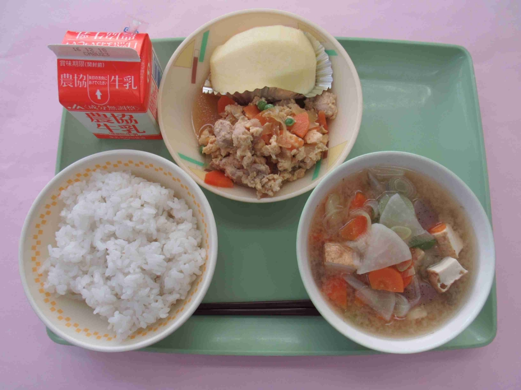 ・麦ごはん ・牛乳 ・親子煮 ・田舎汁 ・リンゴ