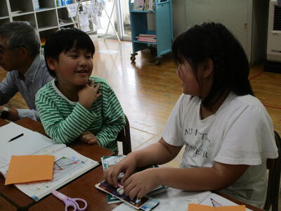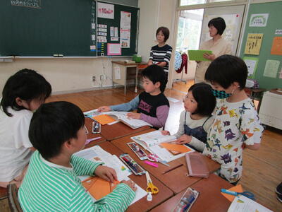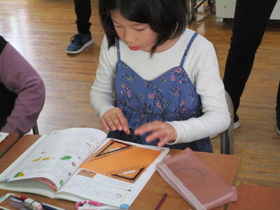 今日は、3校時目に2年生の授業研究会が行われました。今日の授業の課題は、「先生の娘さんに、正方形の書き方について教えてあげよう」です。単に正方形の特徴を見つけるだけでなく、その書き方を「説明する」という課題はかなり難しいですが、子どもたちは5人で話し合いながら一つ一つ説明の内容を見つけていくことができました。「辺」「直角」「長さ」「同じ」など、大切なキーワードを使って友だちと説明し合うことで、子どもたちの論理的な思考力も鍛えられたようです。