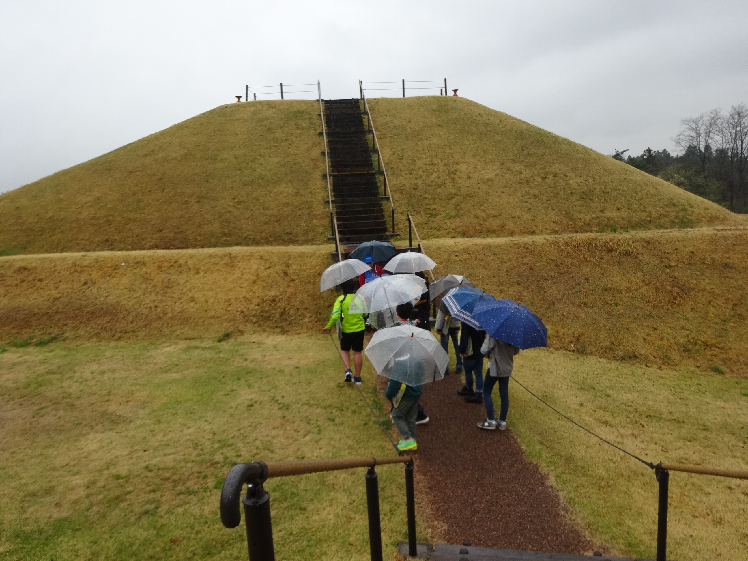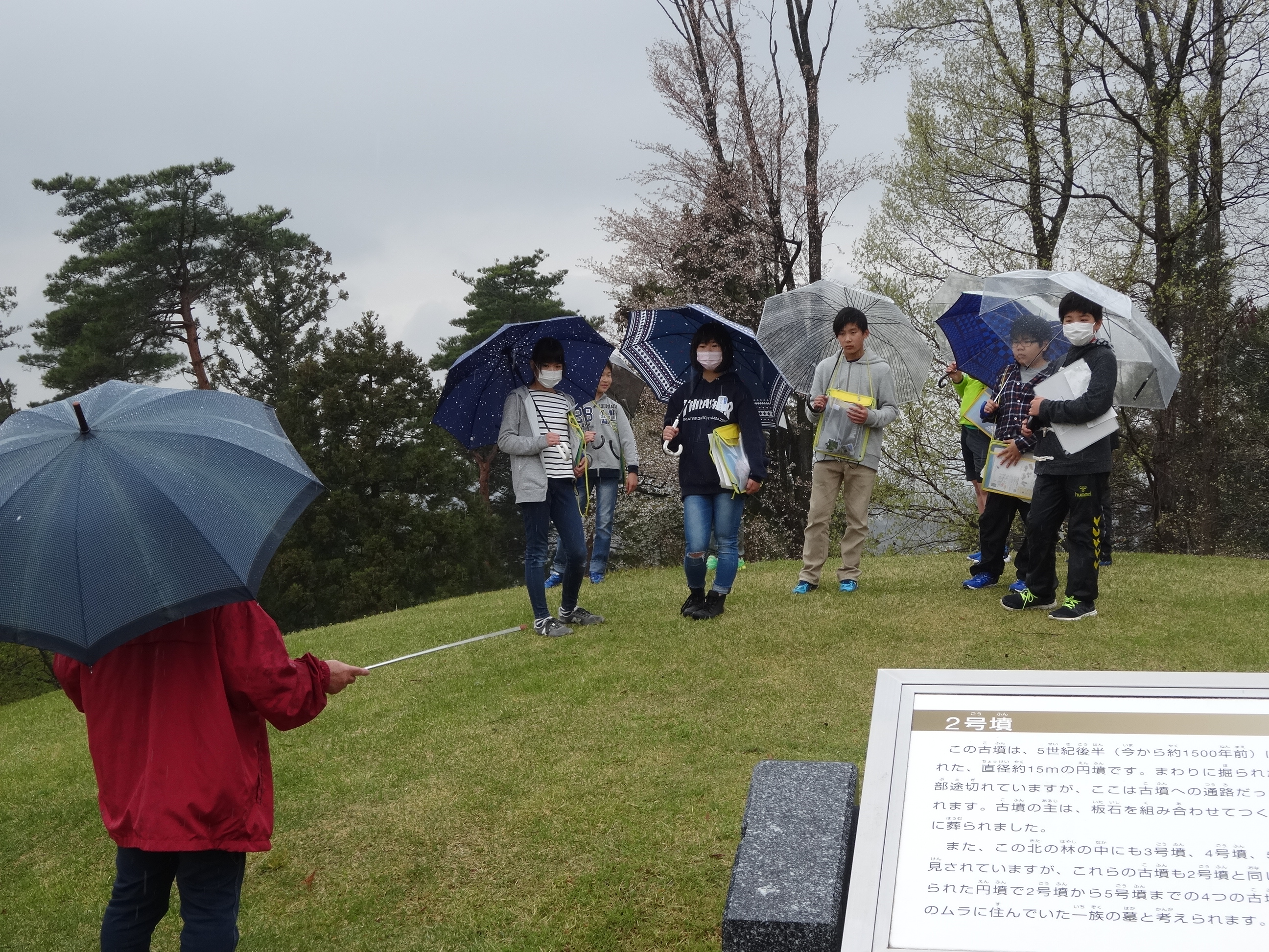 2018年4月18日 12時49分あいにくの雨の中、6年生が市の研修バスを使って大安場古墳へ見学学習に行ってきました。