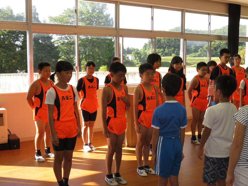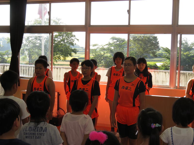 2019年9月30日 08時59分8:15より陸上交流大会に向けた、「壮行会」を行いました。選手紹介後、5・6年生の選手は、それぞれ自分の目標について力強く決意表明しました。校長先生からは、今まで準備してきたことをもとに、自分の力を出し切って来て欲しいとの励ましの言葉がありました。選手を代表して6年生が、励まし合って練習してきた成果を発揮し、自己ベストを出してきたいとお礼の言葉を述べました。大会は、鳥見山陸上競技場を会場に10月3日(木)の9:30から競技が開始されます。少雨決行ですが、台風が接近中ですので、変更がありましたらお知らせいたします。