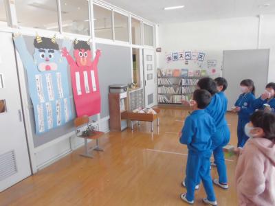 代表児童が教室に戻ると,各教室で大きな声で豆まきが始まりました。今日,追い出した心の中の鬼が,二度と動き出さないようになってくれるといいですね。