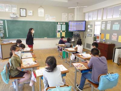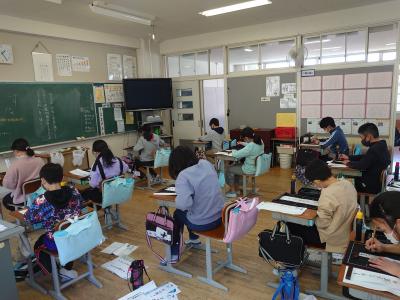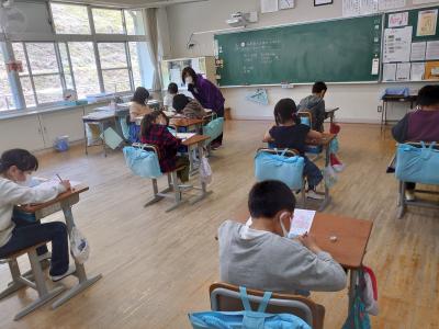 授業風景です。 一枚目は6年生が書写に取り組んでいる風景です。小筆で「きずなを深める」と短冊状の半紙に書きました。二枚目は5年生が外国語科の学習をしている風景です。ALTの先生の発音を真似て一生懸命に英語で会話をしていました。三枚目は3年生、4年生学級の風景です。3年生はワークテスト、4年生は話合いの学習に取り組んでいました。どの学年も担任とともにまじめに学習しています。