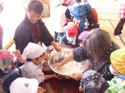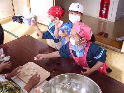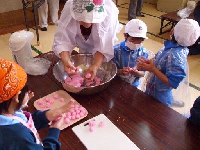 まず,ミズノキに飾るだんごを作ります。ボランティアの方々に教えていただきながら,一生懸命に粉をこねました。