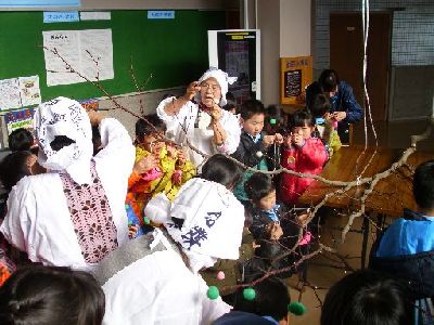 2016年1月15日 19時30分 1月14日(木) 今日は,1年生が生活科の時間に,大東公民館に出かけました。公民館事業「ふるさと歳時記だんごさし」に参加しました。