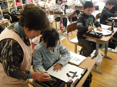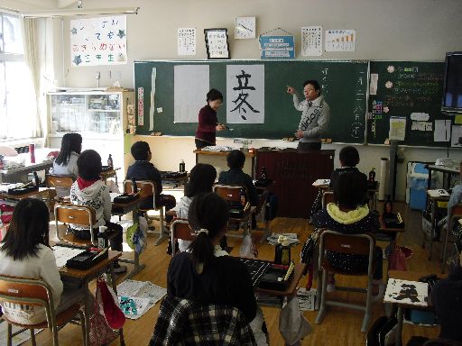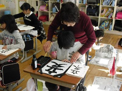 2016年1月28日 17時08分 1月28日(木) 今日は,3年生の教室で学習支援ボランティアの先生2名をお招きして「習字」の学習を行いました。手を取りながらていねいにご指導いただきました。ありがとうございました。