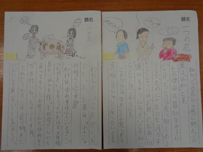 4年生が、国語科の学習で、「一つの花」の単元の学習をし、最後の時間に「一つの花から感じ取った言葉」をキーワードに、感じ取ったことを先生方に宛てたはがきの形で書きました。