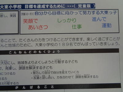 ホームページの「学校案内」にある「大東小学校学校目標達成ビジョン」(「学校版」「児童版」「家庭版」に児童スローガンが入りました。ご覧ください。