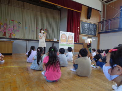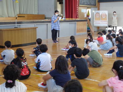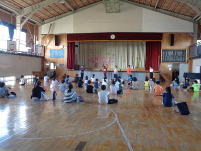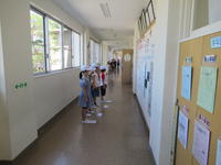 2020年6月15日 11時15分今日は、体育館で全校集会を行いました。体育館で全員で行ったのは、今年度初めてです。間隔をとりながら、さわやかな風が吹く中、戸を開け放って行いました。
