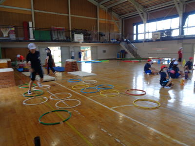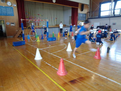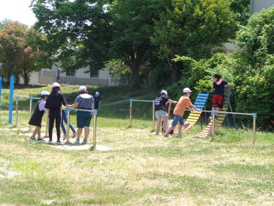 2020年6月9日 14時30分今日は、6年生が朝の時間に様々な器具を組み合わせた場をつくりました。各学年が、それを使って体育の授業を行いました。6年生も5時間目に、ゾーンリレーを行いました。ジグザグのコースやマット、跳び箱など、チームごとに楽しみながら行いました。