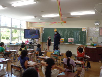 校長から、いつものように、命を守る学習の大切さについて話をしました。「命を守る学習は、100点満点でなければならないといつも話しています。また、担当から、「お・か・し・も」の中の3つの「し」・・・「しゃべらない」「しっかり」「しじをきく」について、話がありました。