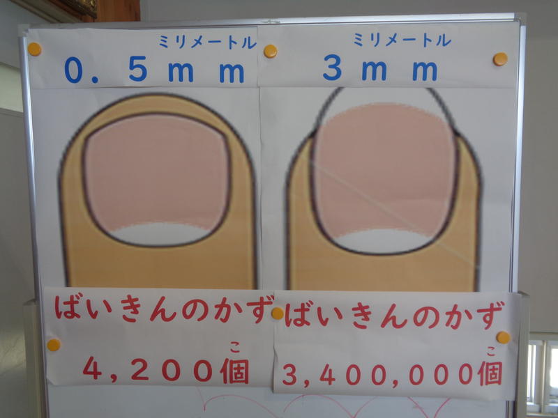 つめを0.5ミリメートル伸ばしているときのばい菌の数は、4200個、3ミリメートル伸ばしているときのばい菌の数は、3400000個だそうです。つめをきれいに切っていることが大切なことがわかりますね!