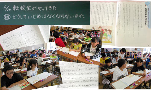 5年生は、「いじめについて」、転校生が来たという題材から学習していました。