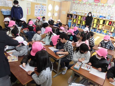2018年2月1日 16時10分こども園の年長組21名が小学校で体験入学をしました。教室などをめぐった後、