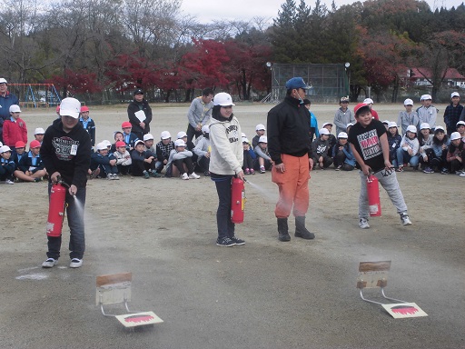 2016年11月17日 11時25分 予告なしの避難訓練が行われました。休み時間に火災が発生したという設定で、子どもたちはそれぞれに校庭に避難しました。避難後に消防署の方からお話を聞き、消火器を使った消火を体験しました。