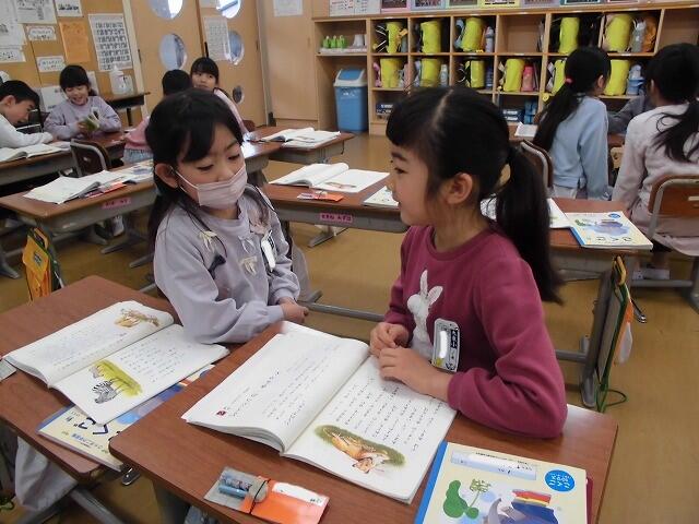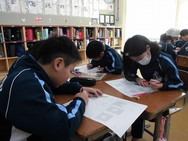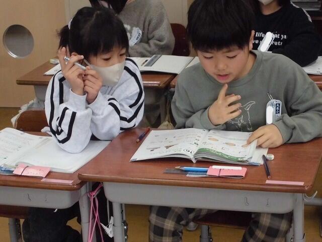 2025年1月20日 10時38分2年生の算数では、図を使って問題を解きました。いくつ使ったか分からないところは「 ▢ 」で表し、全体と残りを図に書き入れました。すっかり図の表し方を理解し、問題を自分で作って友達に出題していました。ペアで確かめ合いながら学習を進めていました。