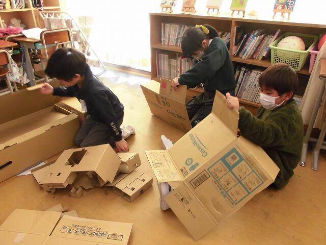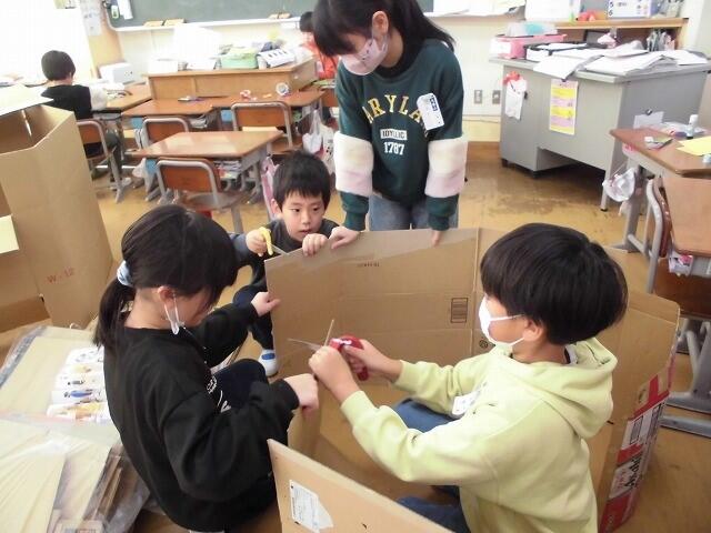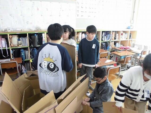 2024年12月17日 09時59分3年生の図工では、たくさんの段ボールを組み合わせて迷路など大型のものをグループで相談して造っていました。段ボールに切り込みを入れて別の段ボールを差し込んで立たせるなど子どもたちになりに工夫していました。みんなの思いを形にしていく活動に子どもたちは心から楽しんで取り組んでいました。