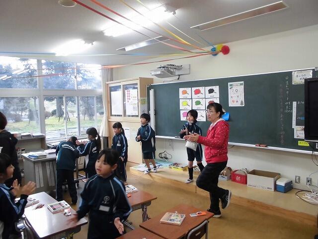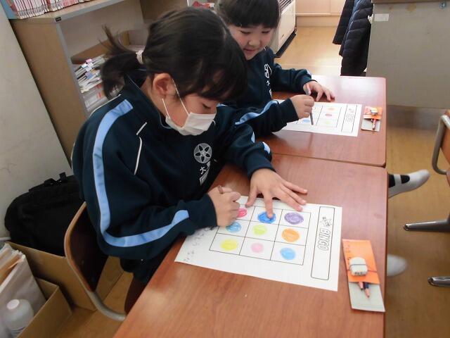 2024年12月18日 09時26分1年生がALTの先生と一緒に勉強しました。英語での色の言い方を覚え、ALTの先生の英語を聞き取り、英語で言われた色を学級内から見つけたり、色ビンゴをしたりして楽しみました。なかなかALTの先生と触れ合うことが少ない1年生。大盛り上がりで学習していました。