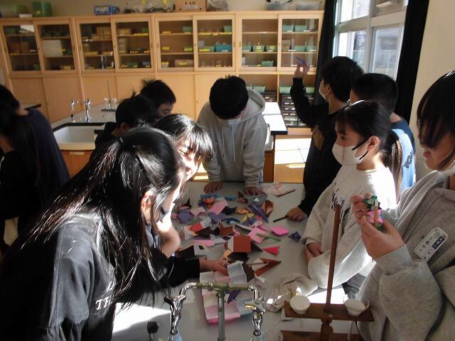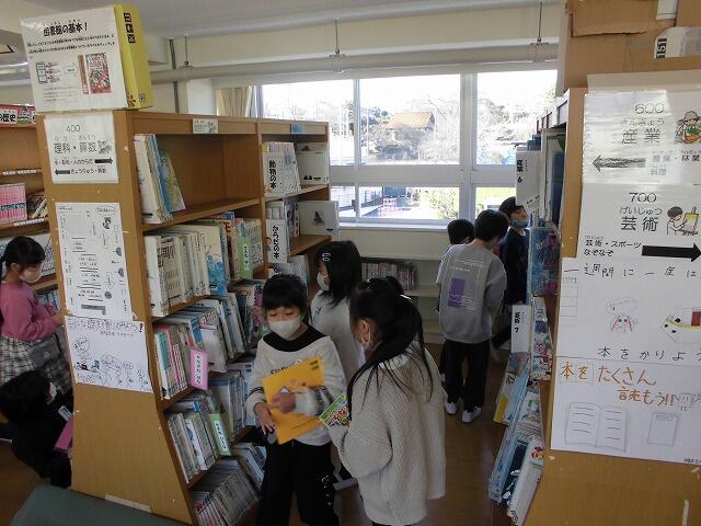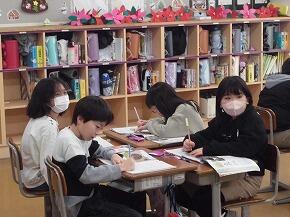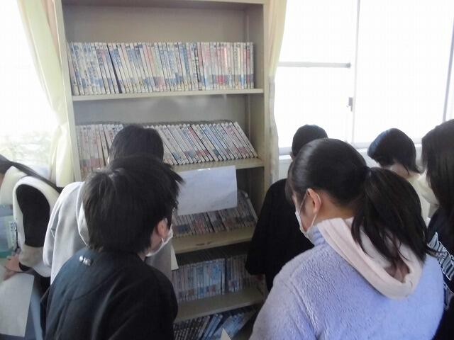 2024年12月18日 11時09分今、図書スペースでは時間を分けて冬休みに読む本の貸し出しを行っています。2年生が本を借りに集まってきました。読書好きが多い2年生。思い思いに読みたい本を見つけていました。学校司書の先生がPCで紹介してた本に興味を示し、早速その本を探したす子もいました。様々な本と出会い、心を耕してほしいと思います。